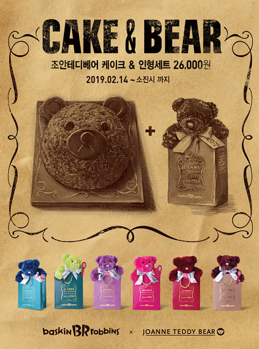 배스킨라빈스가 밸런타인데이를 맞아 ‘조안테디베어 케이크·인형 세트’ 프로모션을 진행한다. 세계적인 테디 베어 아티스트 조안 오가 제작한 ‘조안 테디베어’ 콘셉트의 케이크와 인형 세트를 판매한다. 조안 테디베어의 동그란 얼굴 모양을 재현한 아이스크림 케이크로, 초콜릿, 베리베리스트로베리, 바닐라 아이스크림이 들어간다. 케이크와 함께 제공되는 인형은 ‘가방 속 인형’(Bear in a bag) 콘셉트로 핑크, 보라, 와인, 그린, 블루, 브라운의 6가지 색깔이다.