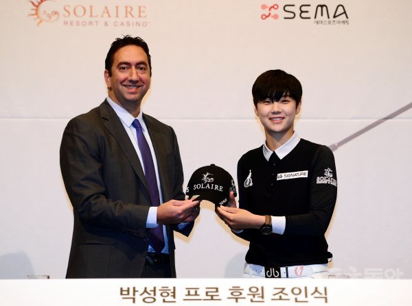14일 서울 소공동 롯데호텔에서 여자프로골프 박성현 프로가 필리핀 블룸베리 리조트 앤 호텔과 메인 후원 조인식을 가졌다. 박성현이 싸이러스 쉐라팟 부사장과 함께 기념촬영을 하고 있다.