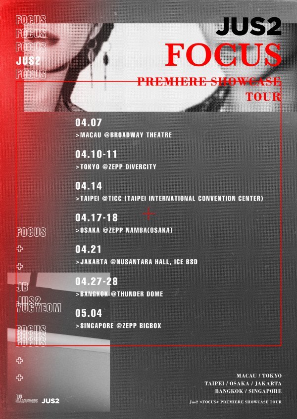 JYP엔터테인먼트(이하 JYP)는 15일 오후 6시 JYP NATION 및 GOT7 공식 채널에 \'Jus2 <FOCUS> PREMIERE SHOWCASE TOUR\'의 일정 공지 포스터를 공개했다.