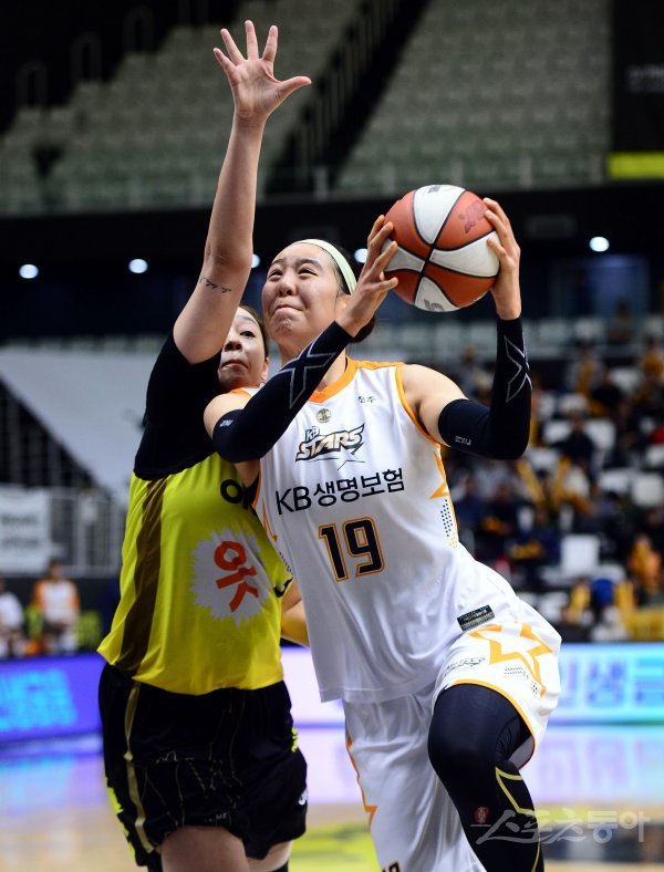 14일 경기도 서수원 칠보체육관에서 열린 ‘우리은행 2018-2019 여자프로농구’ 수원 OK저축은행과 청주 KB의 경기에서 KB 박지수가 OK저축은행 정선화의 수비를 피해 슛을 쏘고 있다.