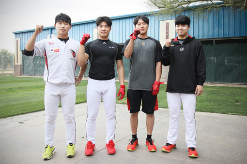 KT 위즈는 1군 스프링캠프지인 미국 애리조나에 신인 6명을 포함시켰다. ‘최대어’ 이대은이 가장 주목받지만 다른 5인도 구슬땀을 흘리고 있다. 고성민, 이상동, 전용주, 손동현(왼쪽부터)이 포즈를 취하고 있다. 사진제공|KT 위즈