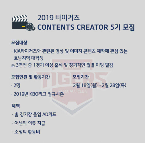 KIA 타이거즈가 독창적이고 재미있는 콘텐츠를 기획, 제작할 ‘타이거즈 C.C.(콘텐츠 크리에이터·contents creator)’를 모집한다.