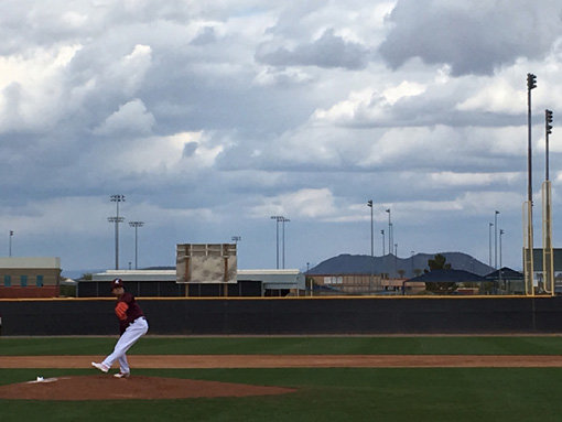 키움 히어로즈 허민 사외이사 겸 이사회의장이 18일(한국시간) 미국 애리조나주 피오리아 베이스볼콤플렉스에서 열린 키움의 자체 청백전에서 선발투수로 마운드에 올라 공을 던지고 있다. 사진제공 | 키움 히어로즈