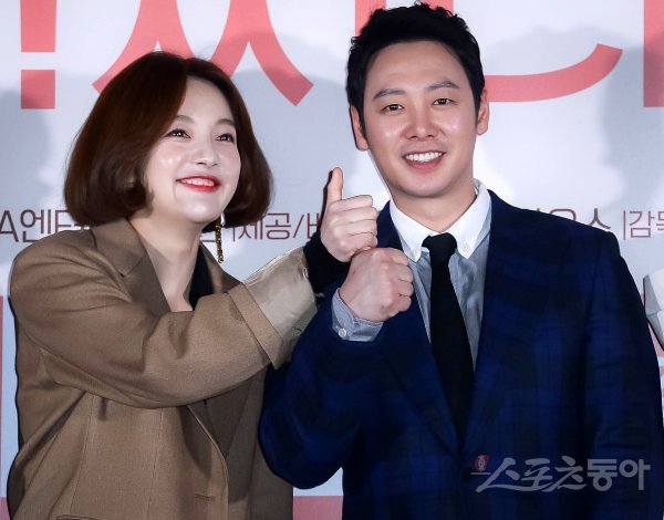 배우 황보라와 김동욱(오른쪽)이 18일 서울 용산구 CGV 용산아이파크몰에서 열린 영화 ‘어쩌다, 결혼’ 언론시사회 및 기자간담회에서 포즈를 취하고 있다.