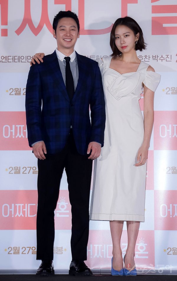 배우 김동욱과 고성희(오른쪽)가 18일 서울 용산구 CGV 용산아이파크몰에서 열린 영화 ‘어쩌다, 결혼’ 언론시사회 및 기자간담회에서 포즈를 취하고 있다.