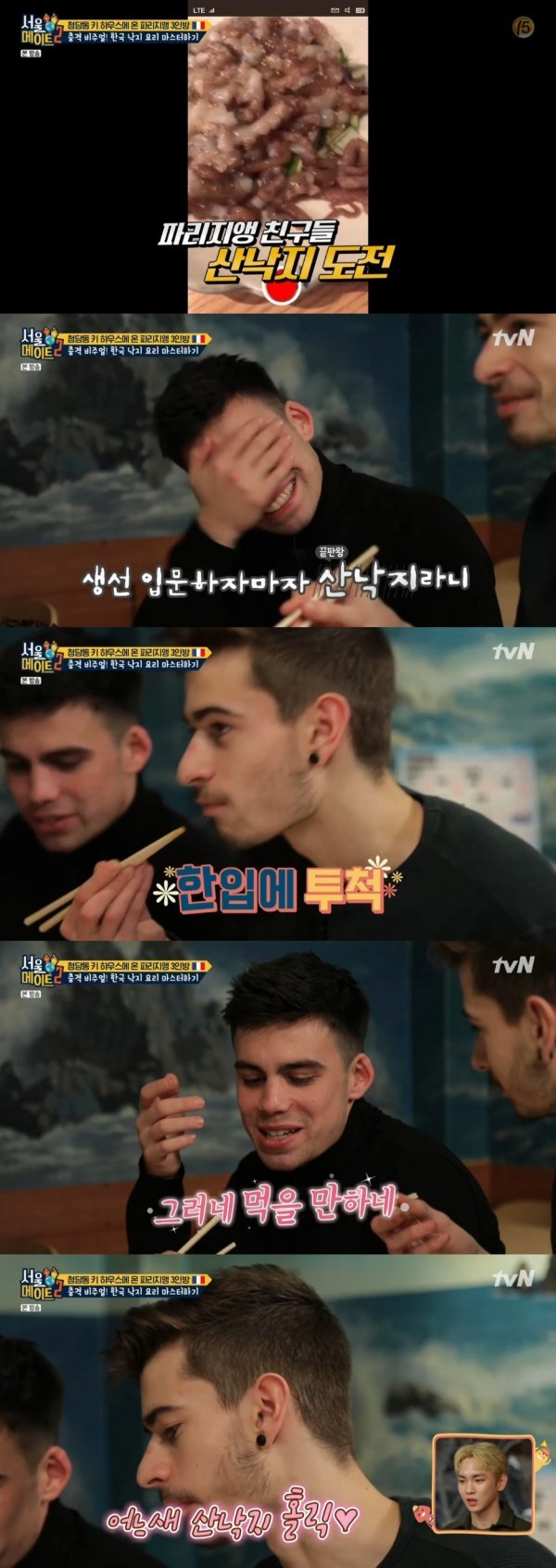 18일 오후 방송된 tvN 예능프로그램 ‘서울메이트2’에서는 키와 파리지앵 3인방 친구들이 산낙지에 도전하는 장면이 그려졌다.