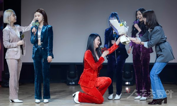 걸스데이 민아가 19일 서울 강남구 청담동 일지아트홀에서 열린 걸그룹 워너비(WANNA.B)의 네 번째 디지털 싱글 ‘레고(LEGGO)’ 발매 기념 프레스 쇼케이스에서 멤버들에게 꽃다발을 전달하고 있다.