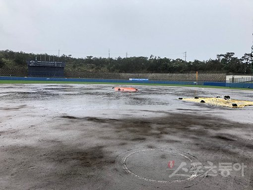 삼성 라이온즈-니혼햄 파이터즈의 연습경기가 취소된 19일 일본 오키나와 온나손 아카마구장. 구장 곳곳에 물웅덩이가 형성됐다. 오키나와(일본)|강산 기자 posterboy@donga.com