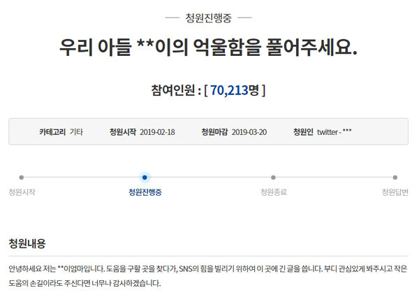 18일 청와대 국민청원 게시판에는 “우리 아들의 억울함을 풀어주세요”라는 제목의 청원이 올라왔다. 청원 내용에 따르면