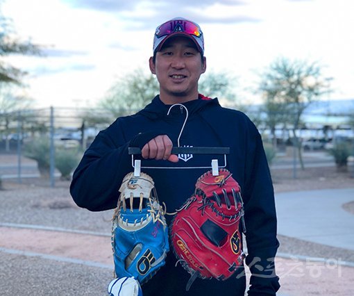 땀에 젖은 이해창의 미트 대기만성형 포수로 불리는 KT 위즈 안방마님 이해창은 땀의 가치를 믿고 있다. 데뷔 10년차를 맞이하는 이해창이 20일(한국시간) 미국 스프링캠프지에서 자신의 미트를 들어 보이며 밝게 웃고 있다. 투산(미 애리조나주)|최익래 기자 ing17@donga.com