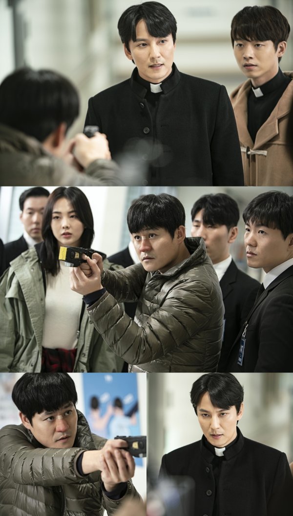 이런 가운데 오늘(22일) 방송되는 ‘열혈사제’ 5,6회에서는 다혈질 사제 김해일과 바보 형사 구대영의 또 한번의 좌충우돌 만남이 그려진다. 이영준 신부의 억울한 죽음에 폭주하는 김해일과 그를 막아서는 구대영의 대치 장면이 공개된 것.