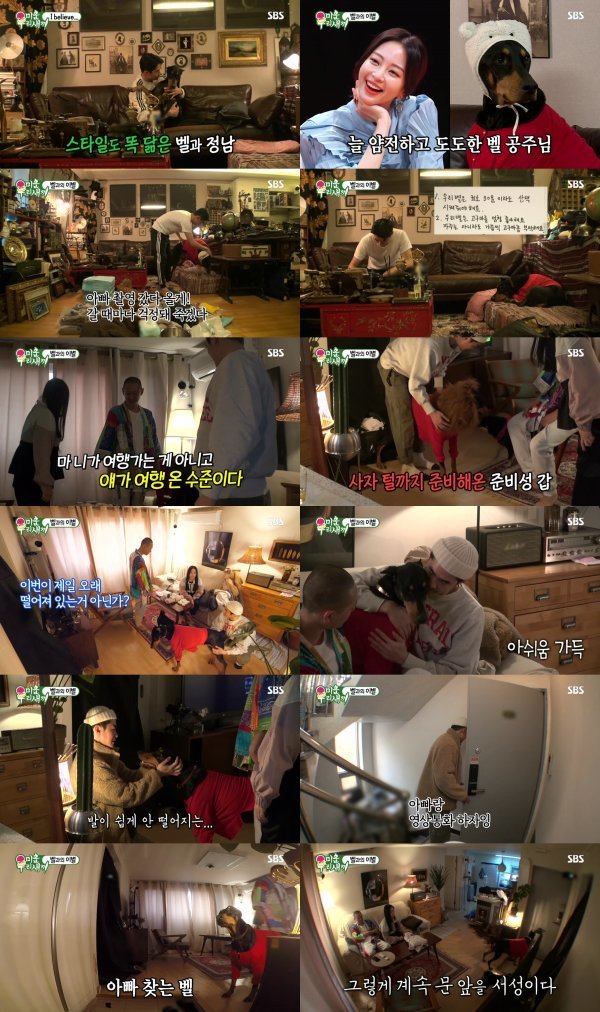 배정남은 벨을 위해 건강에 좋은 간식을 만들어 먹이고, 목욕을 시킨 후 벨을 위한 가방을 챙겼다. 사료부터 배변패드, 평소 사용하던 베개와 이불, 정남이 입던 옷, 심지어 손 편지까지 써서 세심하게 챙기는 모습에 어머님들은 “아빠와 딸같다” “대단하다”며 감탄을 금치 못했다.