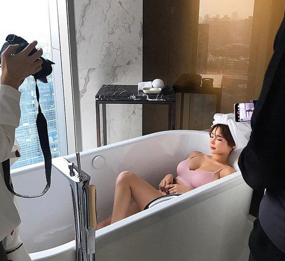 공개된 사진에는 욕조에 누워있는 이아윤의 모습이 담겨 있다. 그는 란제리를 입고 풍만한 볼륨 몸매와 보디 라인을 자랑했다.