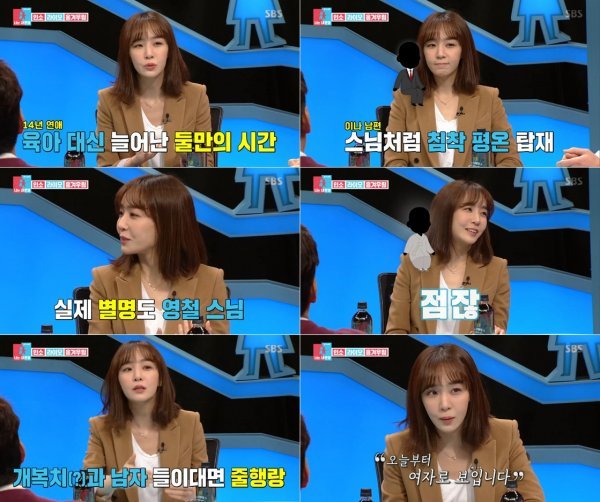 서장훈은 “김이나의 남편을 잘 안다. 우리 소속사 대표”라며 “평소 스님 같고 침착하다. 흥분하지 않는다”고 밝혔다. 김이나는 “맞다. 별명이 ‘영철 스님’이다. 점잖다”며 “내가 수줍고 조심스러운 선비 스타일을 좋아한다. 그런 남자가 귀하다”고 말했다.
