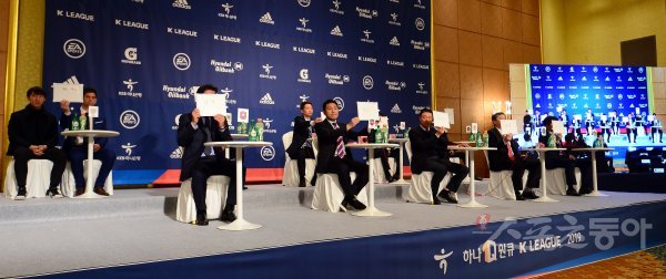 2019 K리그2 개막 미디어데이가 26일 서울시 서대문구 홍은동 그랜드힐튼 서울에서 열렸다. 각 팀 감독들이 우승 후보팀을 적어보이고 있다.