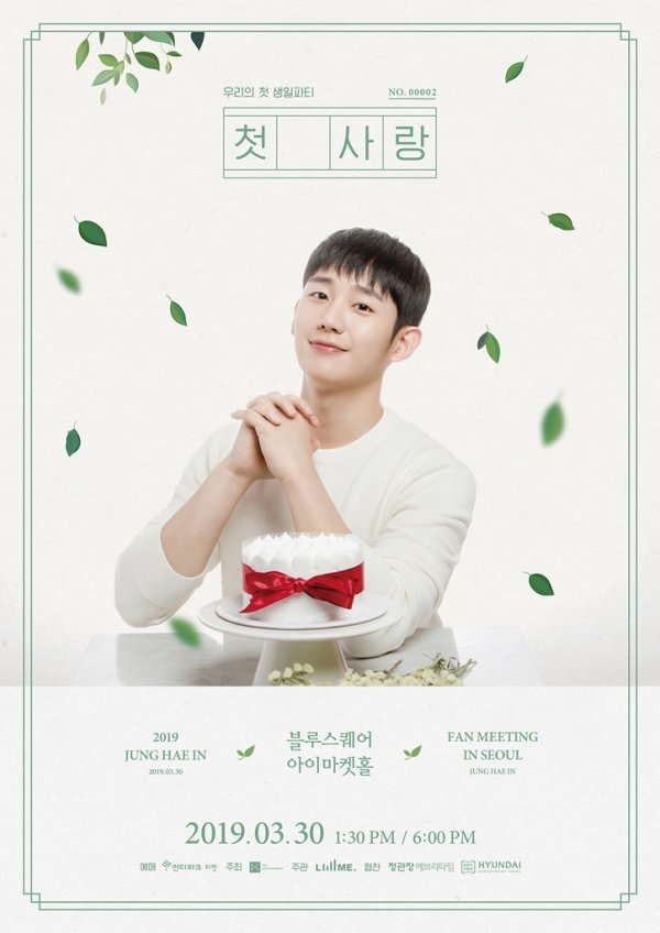 정해인은 오는 3월 30일 ‘2019 정해인 팬미팅-첫사랑’이라는 타이틀로 팬들과 만난다. \'우리의 첫 생일파티\'라는 부제로 열리는 팬미팅은 생일을 맞아 그간 팬들에게 받은 사랑을 보답하고자 마련된 자리다.