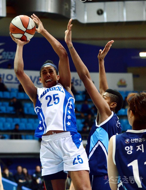 27일 인천 도원체육관에서 열린 ‘우리은행 2018-2019 여자프로농구’ 인천 신한은행과 아산 우리은행의 경기에서 우리은행 빌링스가 신한은행 먼로의 수비를 피해 슛을 쏘고 있다.