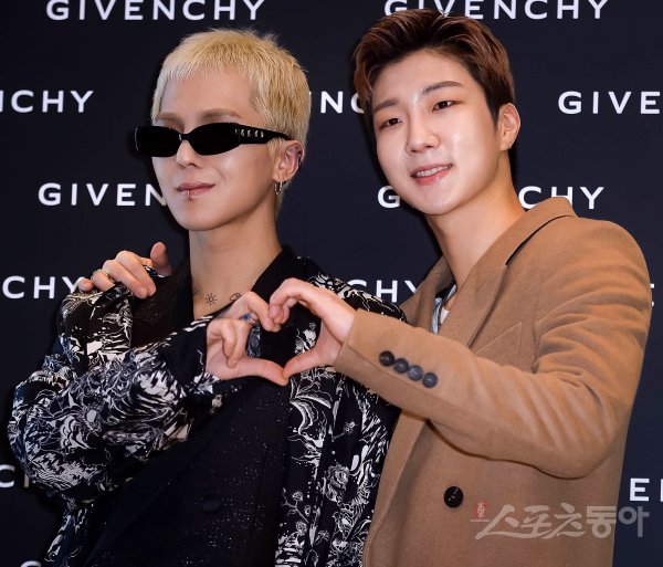 위너 송민호와 이승훈(오른쪽)이 28일 서울 서대문구 신촌로 현대백화점 신촌점에서 열린 지방시 뷰티 런칭 이벤트에 참석해 포즈를 취하고 있다.