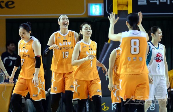 3일 청주체육관에서 열린 ‘우리은행 2018-2019 여자 프로농구’ 부천 KEB하나은행과 청주 KB스타즈 경기에서 KB스타즈 염윤아가 득점 성공 후 추가 자유투를 얻어내자 박지수가 기뻐하고 있다.