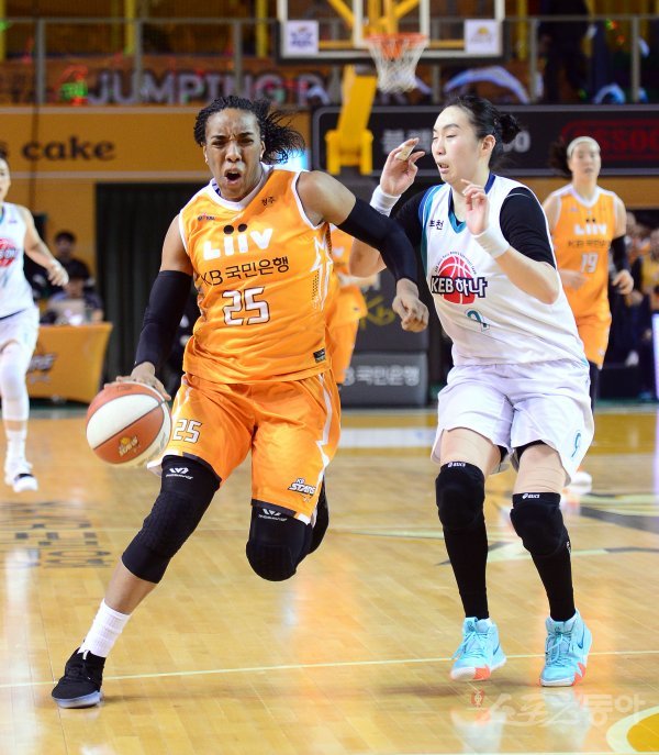 3일 청주체육관에서 열린 ‘우리은행 2018-2019 여자 프로농구’ 부천 KEB하나은행과 청주 KB스타즈 경기에서 KB스타즈 쏜튼이 KEB하나은행의 수비를 뚫고 골밑을 공격하고 있다.