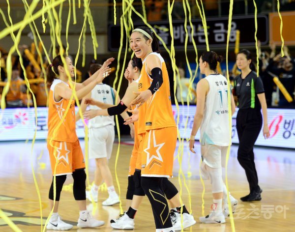 3일 청주체육관에서 열린 ‘우리은행 2018-2019 여자 프로농구’ 부천 KEB하나은행과 청주 KB스타즈 경기에서 승리하며 정규리그 우승을 차지한 KB스타즈 선수들이 환호하고 있다.