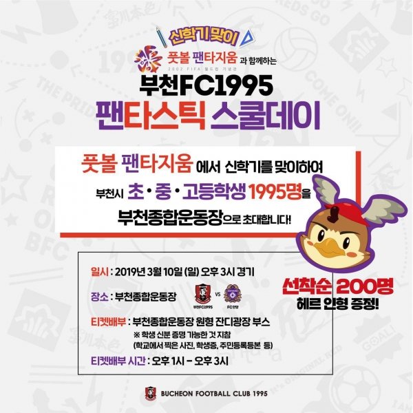 ‘팬타스틱 스쿨 데이’는 신학기를 맞아 부천FC1995와 풋볼 팬타지움이 함께 준비한 이벤트로, 부천의 초·중·고등학교 학생 1995명을 초청한다. 경기 당일 학생 신분을 증명할 수 있는 신분증이나 교복 착용, 학교에서 촬영한 사진 등을 제시하면 풋볼 팬타지움에서 제공하는 부천FC1995의 홈경기 입장권을 받을 수 있다.