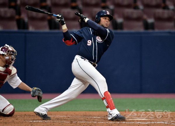3회초 무사에서 두산 페르난데스가 안타를 날리고 있다.
