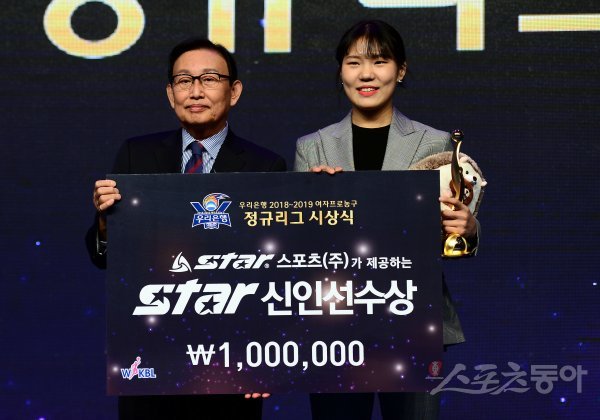 11일 서울 여의도 63컨벤션센터에서 ‘우리은행 2018-2019 여자프로농구’ 정규리그 시상식이 열렸다. 신인선수상을 수상한 우리은행 박지현이 강진구 전무이사와 기념촬영을 하고 있다.
