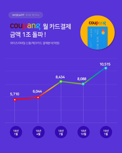 전자상거래 업체 쿠팡의 월 카드결제 금액이 1조 원을 돌파했다는 조사결과가 나왔다.