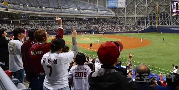12일 서울 고척스카이돔에서 ‘2019 신한은행 MY CAR KBO리그 시범경기’ LG트윈스와 키움히어로즈의 경기가 열렸다. 시범경기에도 불구하고 많은 야구팬들이 야구장을 찾아 응원을 펼치고 있다.