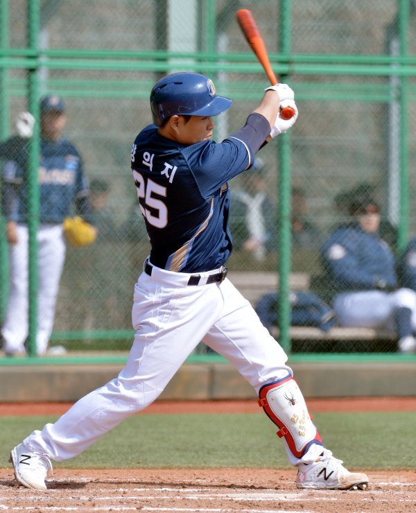 12일 경상남도 김해 롯데상동야구장에서 ‘2018 신한은행 마이카 KBO리그’ 롯데 자이언츠와 NC 다이노스의 시범경기가 열렸다. 4회초 무사 1루에서 NC 양의지가 안타를 날리고 있다.