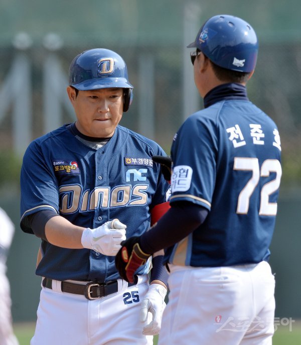 12일 경상남도 김해 롯데상동야구장에서 ‘2018 신한은행 마이카 KBO리그’ 롯데 자이언츠와 NC 다이노스의 시범경기가 열렸다. 6회초 무사 2루에서 NC 양의지가 1타점 적시타를 날린 뒤 전준호 코치의 환영을 받고 있다.