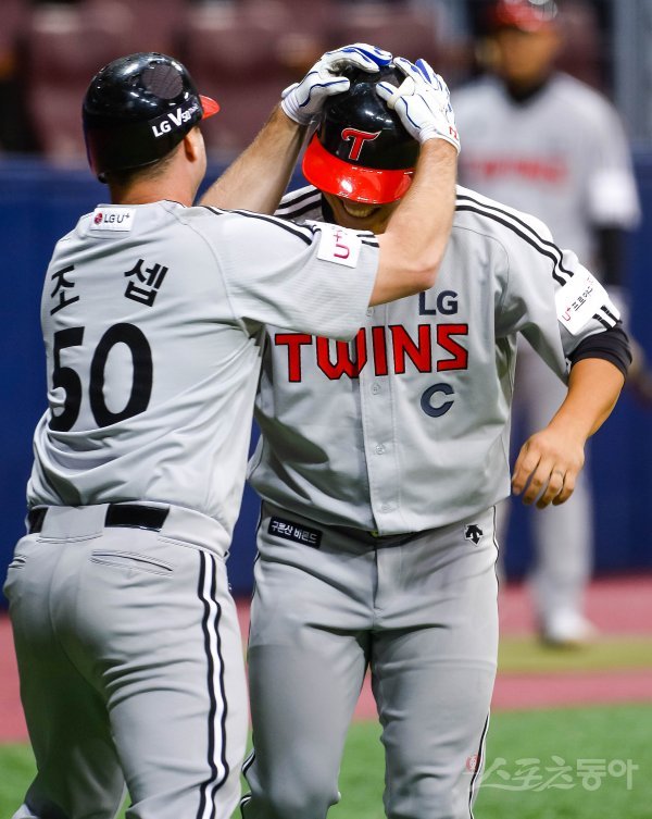 13일 서울 고척스카이돔에서 ‘2019 신한은행 MY CAR KBO리그 시범경기’ LG트윈스와 키움히어로즈의 경기가 열렸다. 5회초 무사 1루에서 LG 토미 조셉이 키움 윤정현을 상대로 투런 홈런을 친 후 김현수와 기쁨을 나누고 있다.