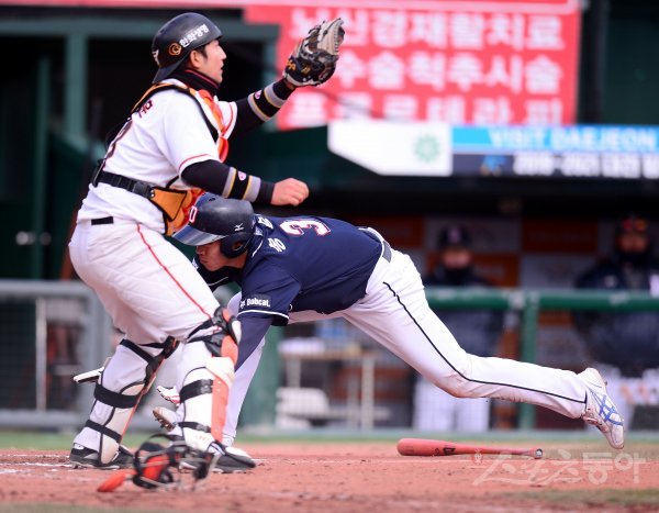 13일 대전 한화생명이글스파크에서 ‘2019 신한은행 MY CAR KBO리그’ 시범경기 두산베어스와 한화이글스경기가 열렸다. 6회초 무사 1,3루 두산 백동현 내야 땅볼 때 3루주자 송승환이 선제 득점에 성공하고 있다.