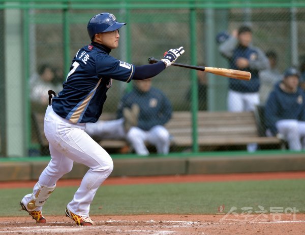 13일 경상남도 김해시 롯데상동야구장에서 ‘2019 신한은행 마이카 KBO리그’ 롯데 자이언츠와 NC 다이노스의 시범경기가 열렸다. 7회초 1사 2, 3루에서 NC 이상호가 2타점 적시타를 날리고 있다.