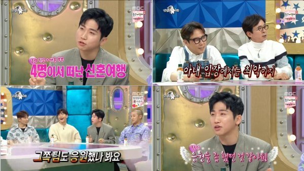 이날 절친들과의 동반 신혼여행이 언급되자 김종국은 “그거 남자들의 로망 아니냐”라고 공감했다. 유세윤은 “내가 실제로 신혼여행을 친구들과 함께 가봤는데 비추천한다”고 반대 의견을 펼쳤다. 김국진도 “아내 입장에서는 최악”이라고 유세윤에 동의했다.