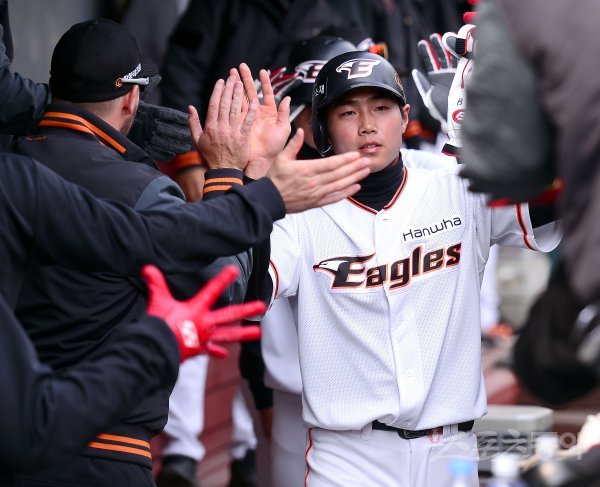 14일 대전 한화생명이글스파크에서 ‘2019 신한은행 MY CAR KBO리그’ 시범경기 SK와이번스와 한화이글스경기가 열렸다. 7회말 1사 만루 한화 변우혁 적시타 때 득점한 장진혁이 더그아웃에서 하이파이브 하고 있다.