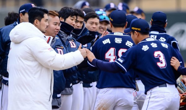 경기 후 두산 선수들이 기쁨을 나누고 있다.