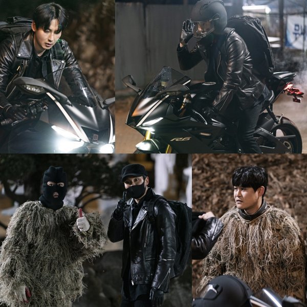 공개된 사진 속 김해일은 사제복을 벗고 가죽 자켓을 입고 있다. 바이크를 탄 채 검은 아우라를 발산하는 김해일의 모습은 멋져서 한 번, 평소 신부님의 비주얼과 달라서 또 한 번 시선을 강탈한다. 여기에 구대영은 나뭇잎으로 뒤덮인 길리슈트를 입고 완벽 위장을 한 모습이다. 진지해서 더 웃긴 구대영의 변신이 긴장감 가득한 상황 속에서도 빵 터지는 웃음을 예고한다.