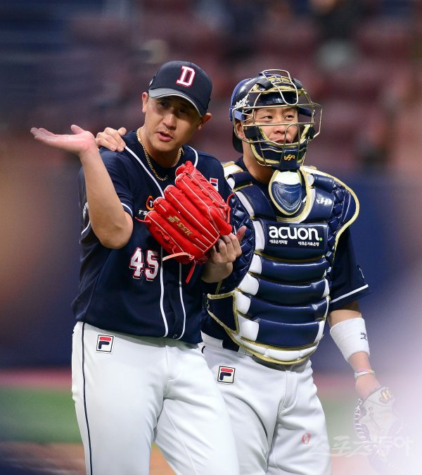 17일 서울 고척스카이돔에서 ‘2019 신한은행 MY CAR KBO리그’ 시범경기 두산베어스와 키움히어로즈 경기가 열렸다. 선발 투수로 등판한 두산 이용찬이 3회말 2사 3루 상황에서 키움 샌즈를 삼진 아웃시킨 후 박세혁과 더그아웃으로 들어가고 있다.