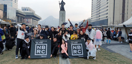 ‘뉴발란스 10주 프로그램’ 참가자들이 17일 서울 일원에서 열린 2019 서울국제마라톤 겸 제90회 동아마라톤 마스터스 부문 출발에 앞서 광화문에서 단체촬영을 하고 있다. 사진제공|뉴발란스