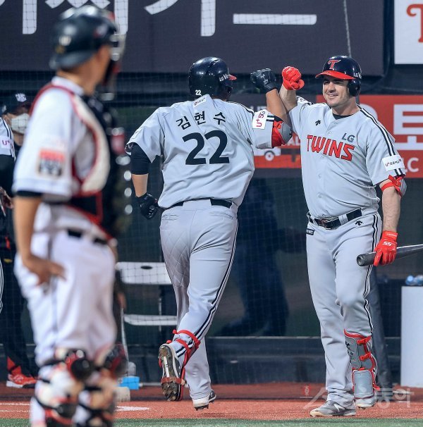 LG 김현수가 3회초 2사 2루에서 kt 선발 금민철을 상대로 투런 홈런을 친 후 토미 조셉(오른쪽)의 축하를 받고 있다.