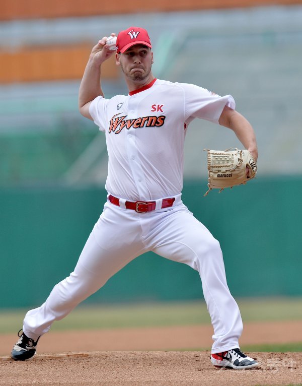 20일 인천 SK행복드림구장에서 ‘2019 신한은행 MY CAR KBO리그’ SK 와이번스와 두산 베어스의 경기가 열렸다. SK 선발투수 다익손이 힘차게 볼을 던지고 있다.