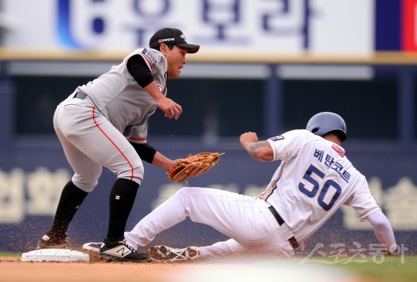 20일 창원NC파크에서 ‘2019 신한은행 MY CAR KBO리그’ 시범경기 한화이글스와 NC다이노스 경기가 열렸다. 4회말 2사 1루 상황에서 1루주자 NC 베탄코트가 2루 도루에 성공하고 있다.