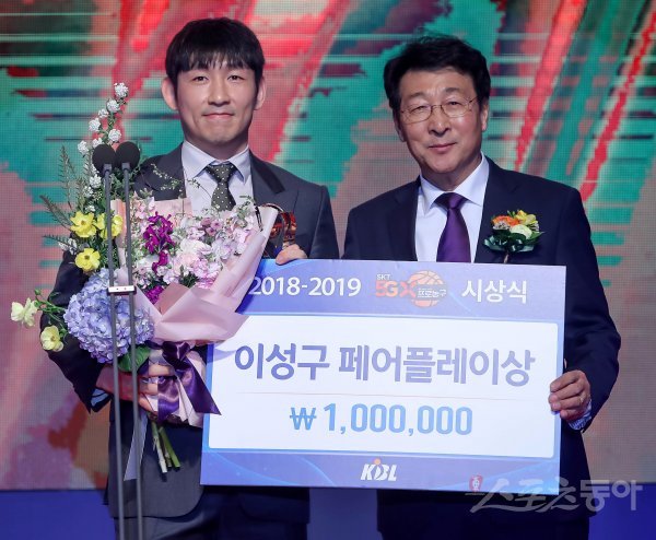 이성구 페어플레이상을 수상한 울산모비스 양동근이 조승연 KBL 재정위원회 위원장(오른쪽)과 기념촬영을 하고 있다.