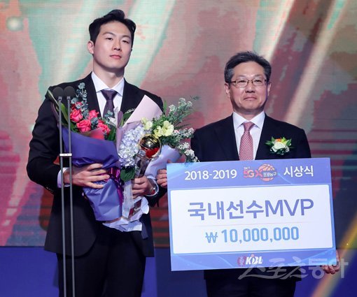 20일 서울 강남구 삼성동 그랜드 인터컨티넨탈 파르나스 서울 그랜드볼룸에서 2018-2019 SKT 5GX 프로농구 시상식이 열렸다. 국내선수 MVP에 선정된 전주 KCC 이정현(왼쪽)이 이정대 KBL 총재와 기념촬영을 하고 있다. 김진환 기자 kwangshin00@donga.com