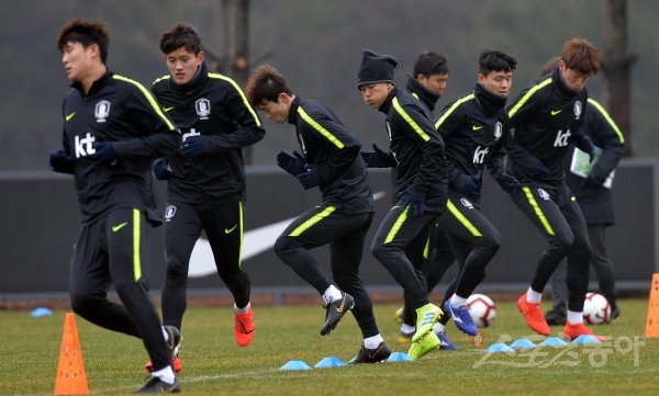 축구대표팀 선수들이 훈련을 하고 있다.