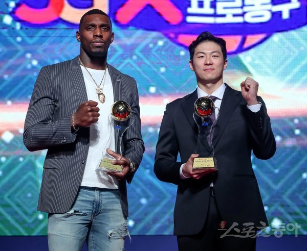 외국인선수 MVP 현대모비스 라건아와 국내선수 MVP 전주KCC 이정현(오른쪽)이 각각 트로피를 들고 포토타임을 갖고 있다.