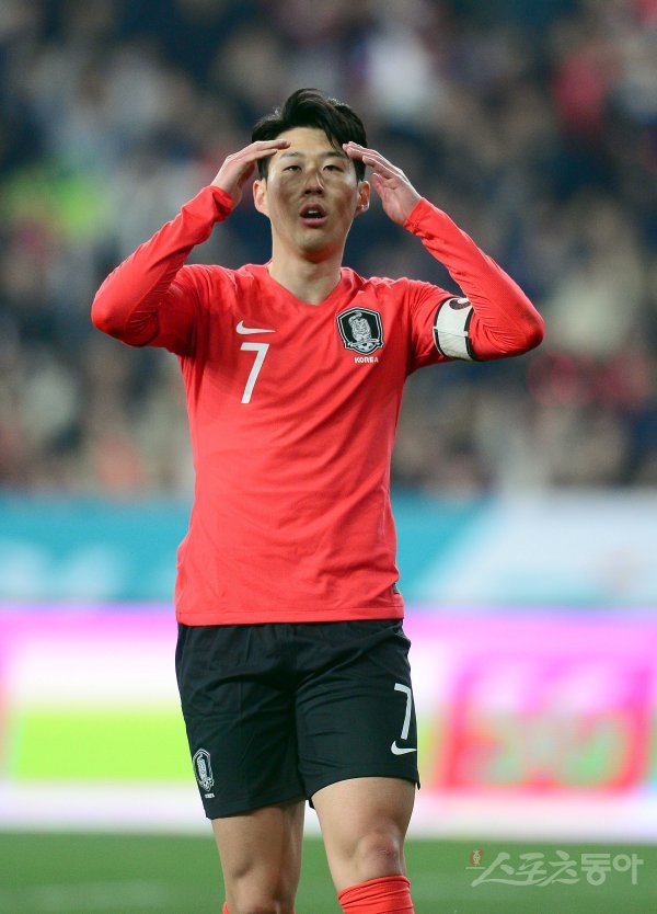 22일 울산문수경기장에서 열린 한국 축구대표팀과 볼리비아의 평가전에서 한국 손흥민이 단독 찬스를 놓친 후 아쉬워하고 있다.