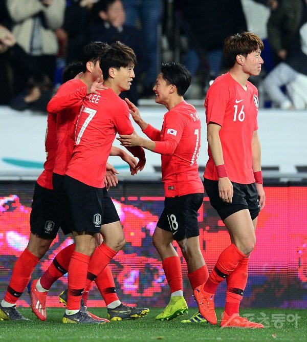 22일 울산문수경기장에서 열린 한국 축구대표팀과 볼리비아의 평가전에서 한국 이청용이 경기 종료 직전 헤딩골을 성공시킨 후 이승우가 기뻐하고 있다.